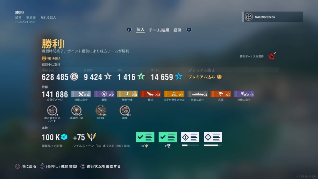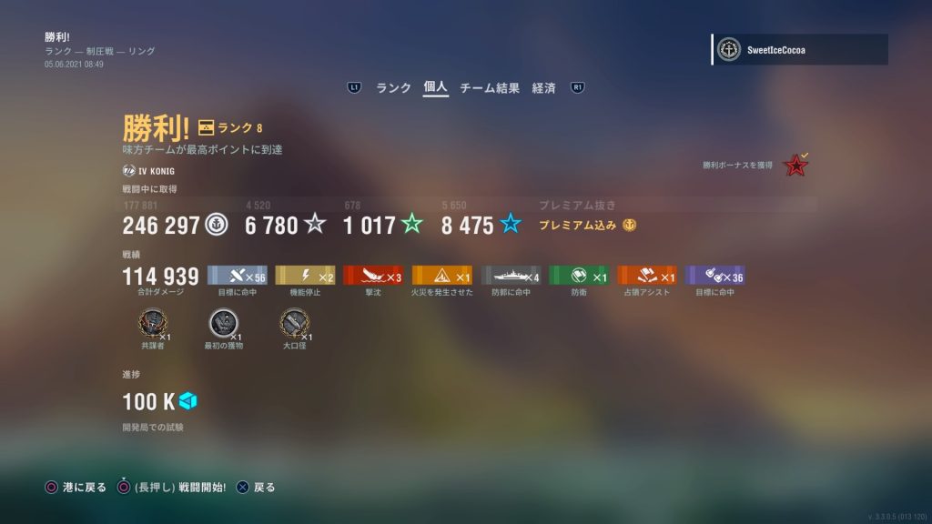 通常戦のソロプレイにて、クイーン・エリザベス艦長で怒涛の10連勝を達成しました! そろそろ新米艦長の域は脱してきたのかもしれない…