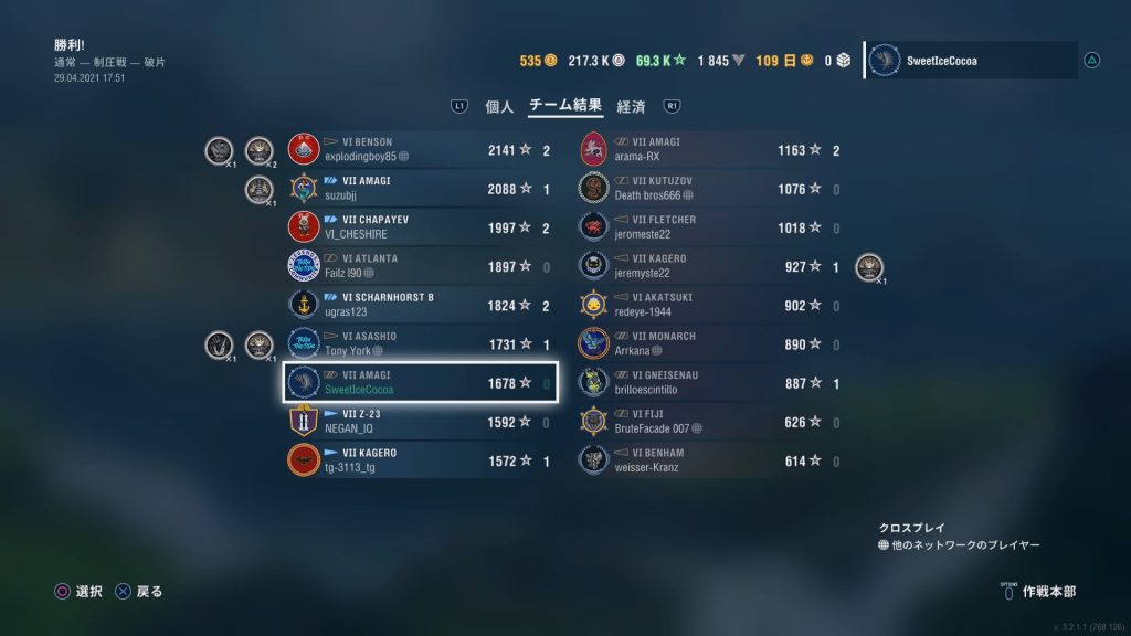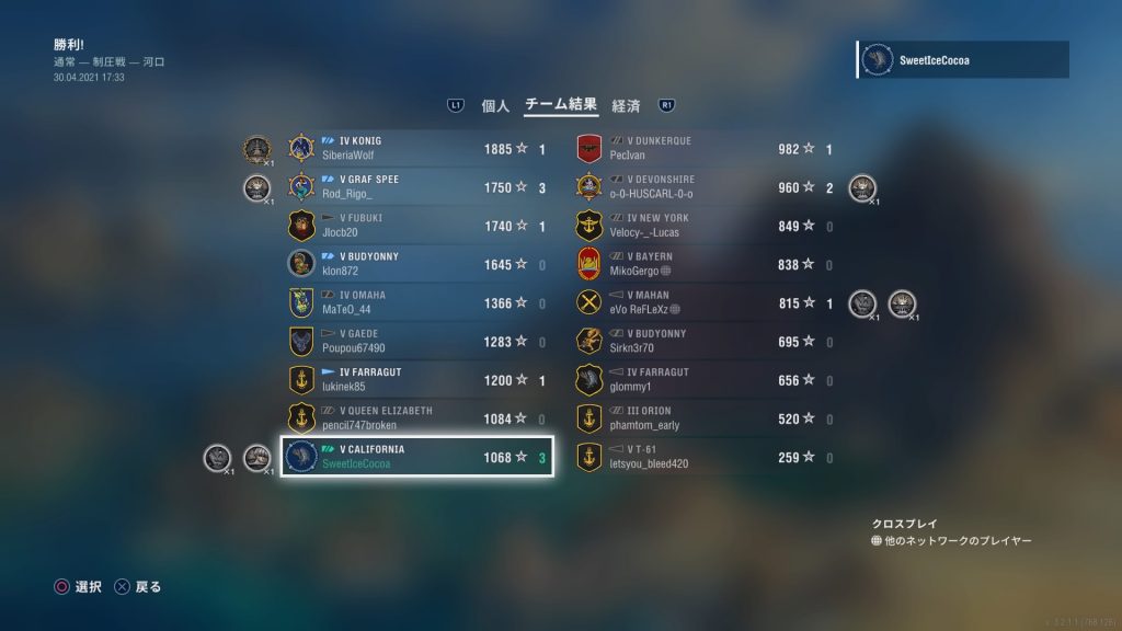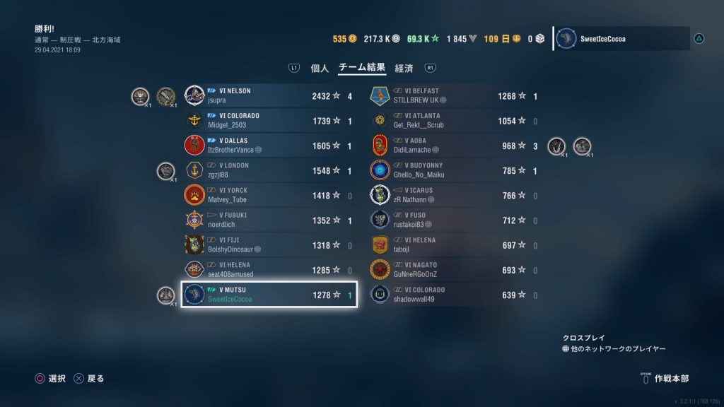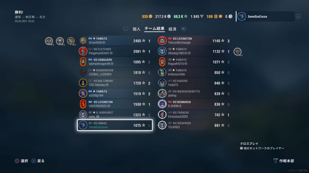 「最初の獲物」と「頑強」とって、3隻撃沈で活躍出来たなと思ったら、チーム内最下位の成績だったという悲しみ…