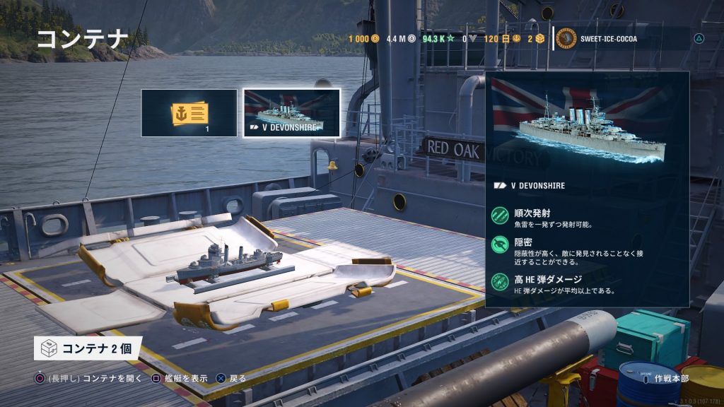 アリーナの報酬で貰ったイギリス巡洋艦クレートからデヴォンシャーが出た。これで無事にホーキンス・デヴォンシャー・サリーの3隻が揃った。