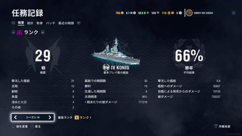 ランク戦ではみんな駆逐艦や巡洋艦を使っているみたいだな。自分の場合はドイツ戦艦ケーニヒ縛りで戦ったんだが、珍しいケースなのかな。