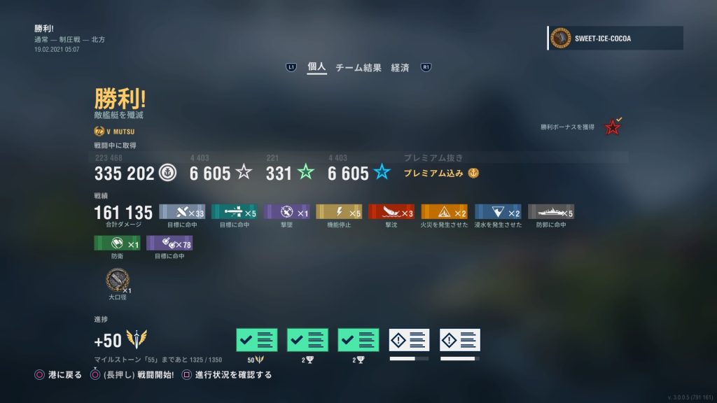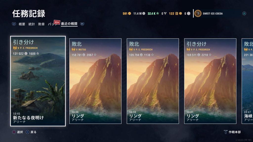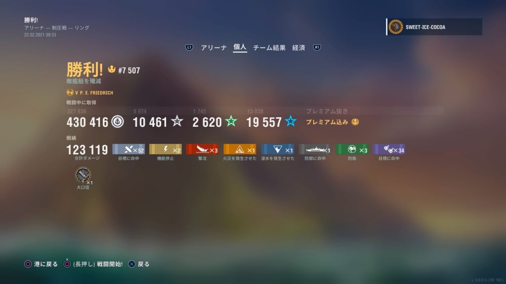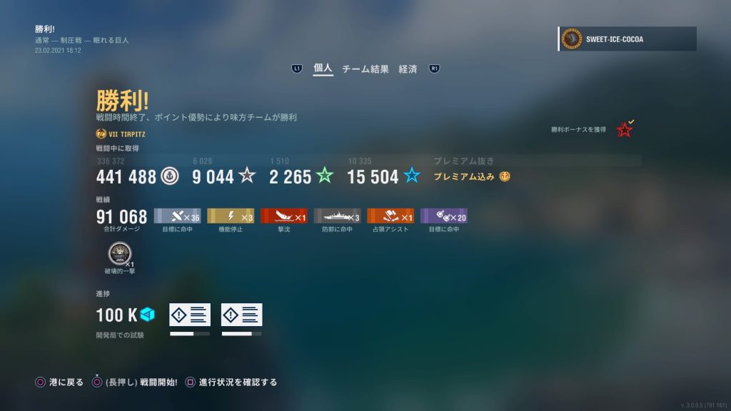 ドイツ戦艦ティルピッツの初陣。こうして見ると戦果は控えめだが、それでもチーム内1位の戦果だった訳だから、勝利に貢献できたのは間違いないと思う。初陣にしては上出来だな。良い船だと思う。