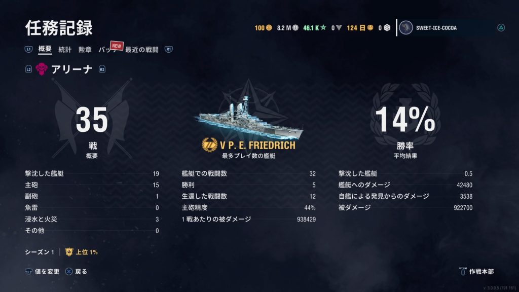 勝率14%とは、なんという有り様か。なんとか上位1%には入っているものの、これじゃ全然喜べないよ。でも勝てない原因が自分にあるのは明らかだな。撃沈数が少ないし、生存率も低すぎる。