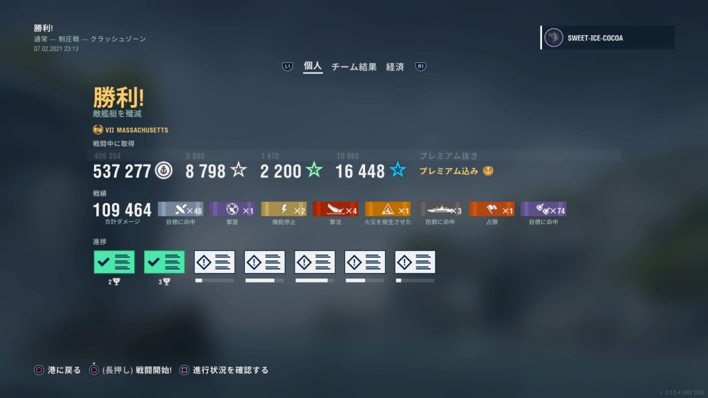 1対3の劣勢から逆転勝利できた。毎度思うんだけど、戦艦使ってて最後に駆逐艦と1対1ってのは辛いな。
