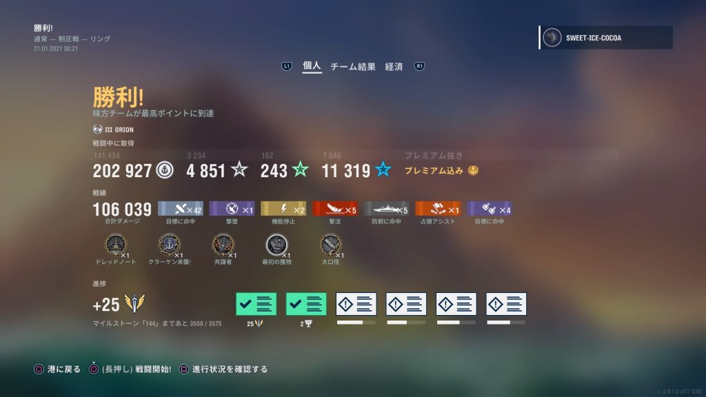 今回のランク戦は過酷だ。味方をアテにしていてはダメで、1人で5隻殺るくらいの覚悟で行かないと勝てない。「より個人技が試される」と公式がアナウンスしていたのはこういう事だったんだな。(ちなみに自分は1人で4隻沈めたのが最高記録でした)