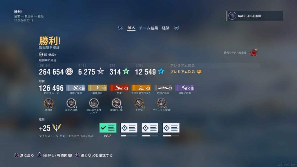 いいぞ、オライオン!! これでまたTier7の魔窟へ戻っていく勇気が出た。こんどこそマサチューセッツを使いこなしてやる!