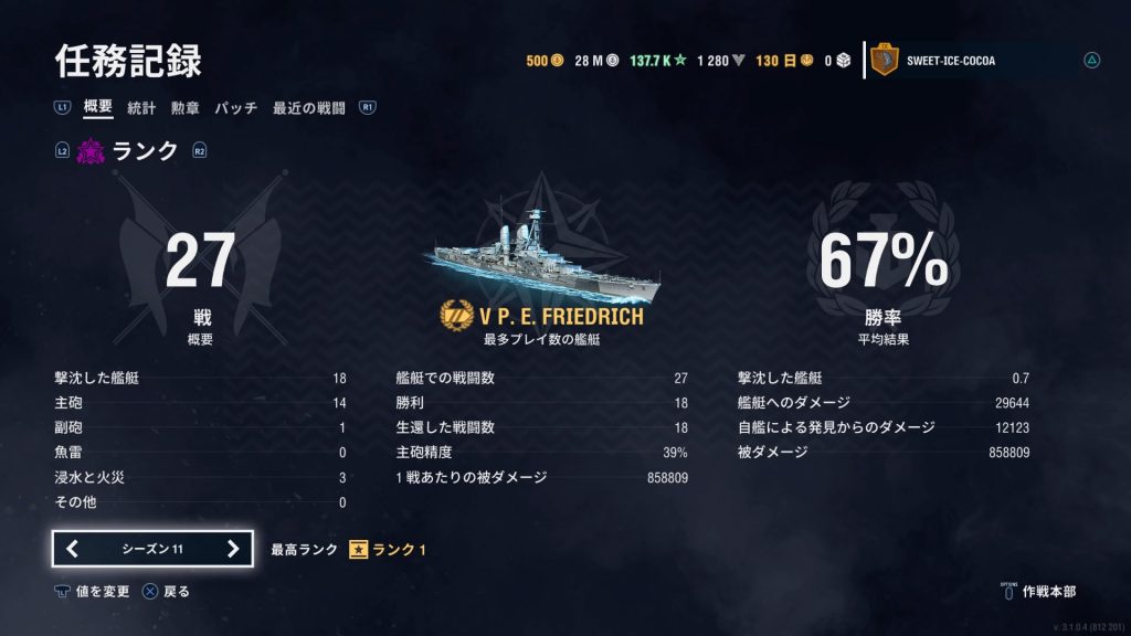 今回のランク戦で試みた実験は興味深かった。ドイツ艦なのに副砲特化を捨て、防御力・回復力・速力で囮作戦に徹した結果、恐ろしく低い与ダメージ数&撃沈数でもランク1まで到達出来る事が実証できた。